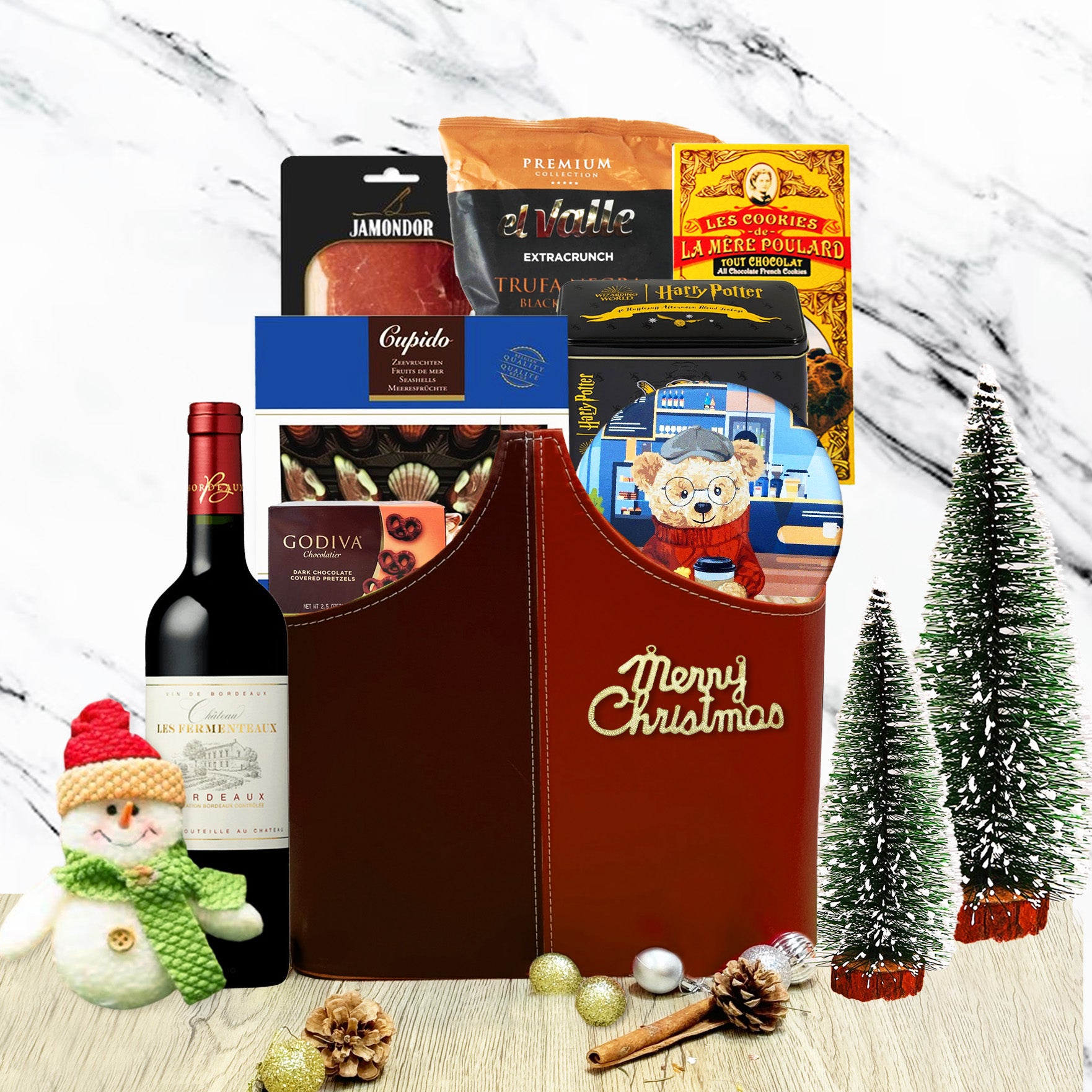 此聖誕紅酒美食禮籃共有 10 件商品 (包含禮籃) ,內容包括:
