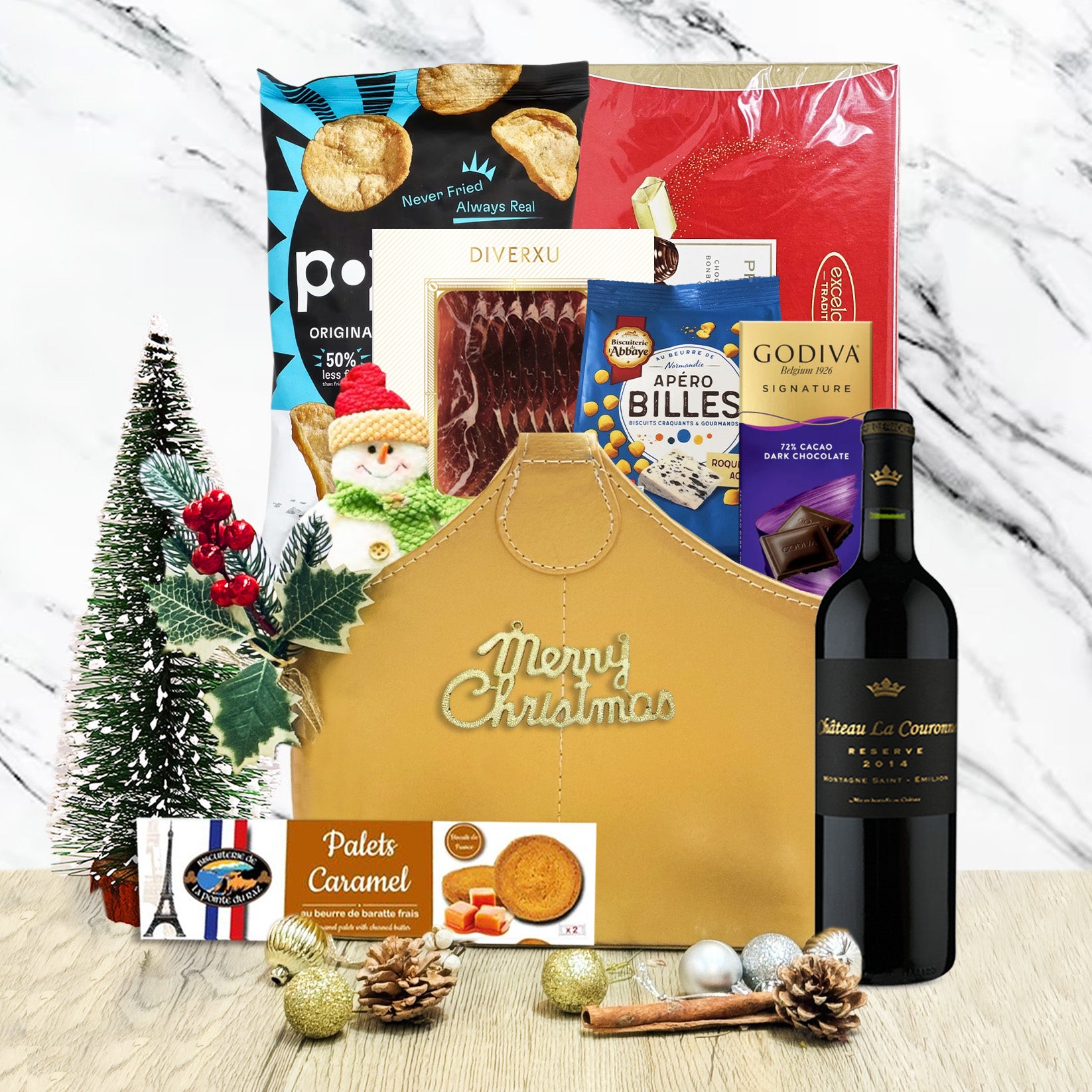 此聖誕紅酒美食禮籃共有 9 件商品 (包含禮籃) ,內容包括:
