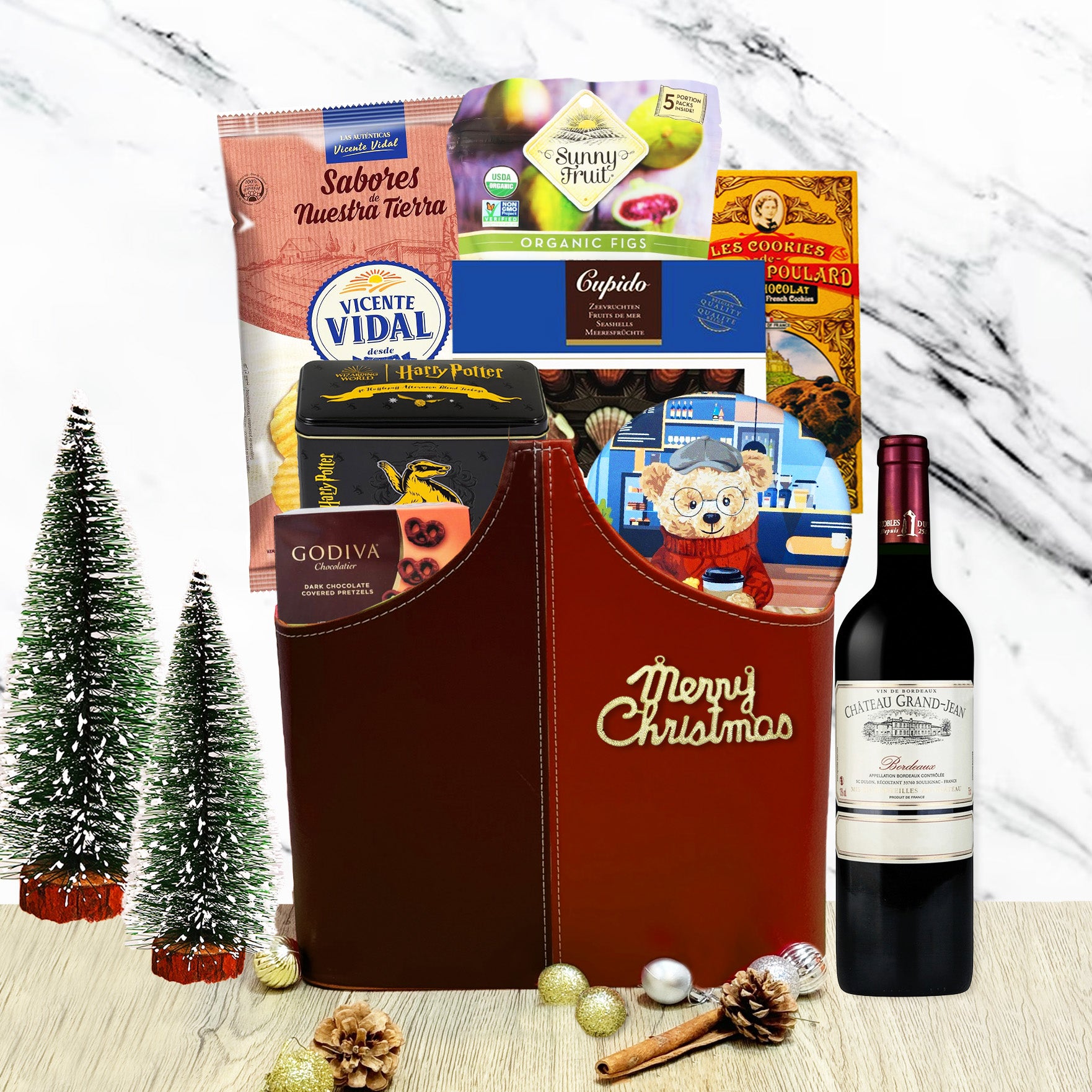 此聖誕紅酒美食禮籃共有 10 件商品 (包含禮籃) ,內容包括: