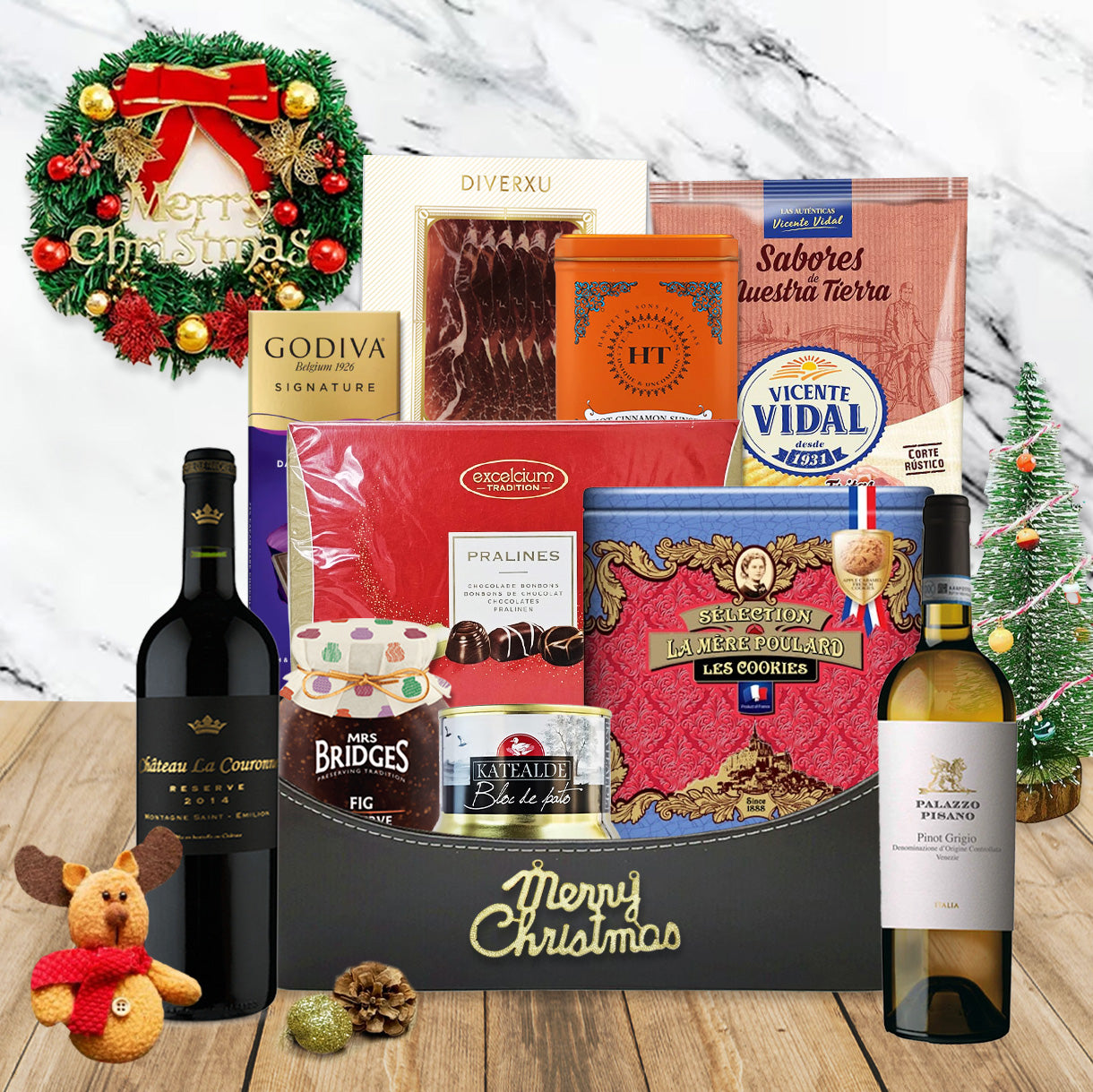 此聖誕紅酒美食禮籃共有 12 件商品 (包含禮籃) ,內容包括: