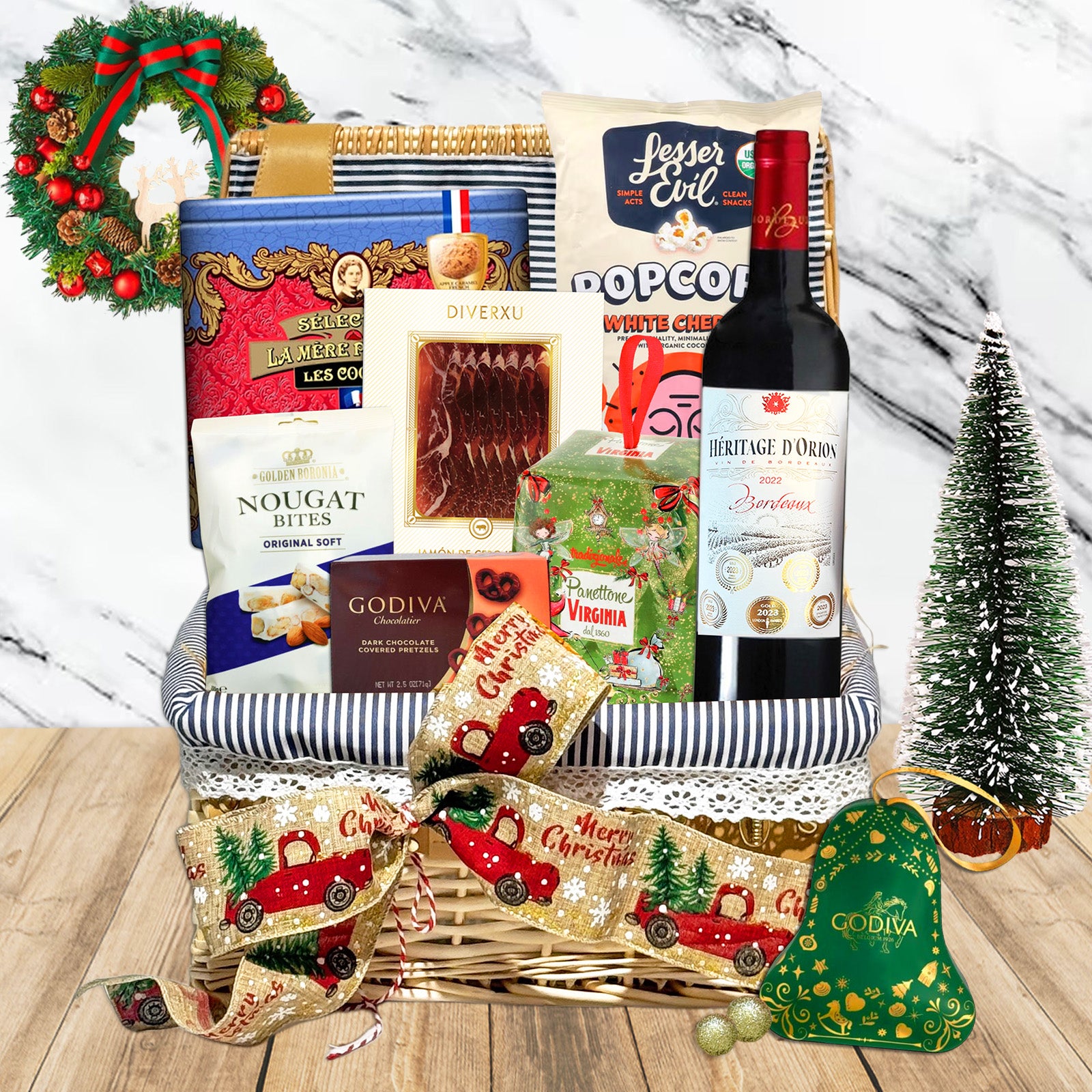 此聖誕紅酒美食禮籃共有 10 件商品 (包含禮籃) ,內容包括: